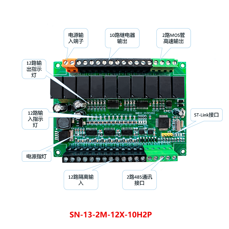 SN13-2M-12X-10H-2P是一款专门为工业环境设计、有10路继电器输出、2路高速光耦输入(不带隔离)、12路光耦隔离输入、2路485通讯,为接线端子接口的可自主编程的工控开发板。