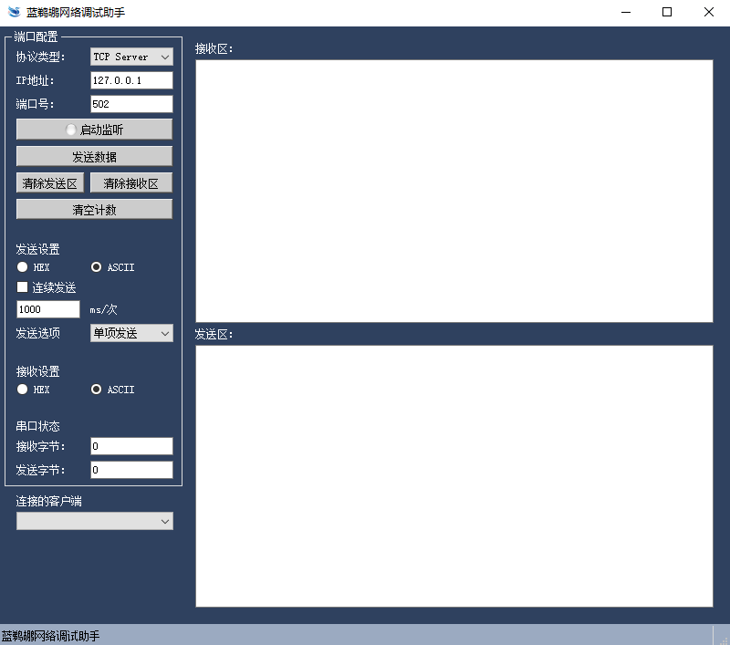 蓝鹈鹕网络调试助手软件,可以通过调试软件跟外部设备的TCP/IP通信。调试软件可以作为服务端和客户端使用。